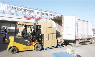 12月19日,工人在中铁快运北京配送中心进行配送。截至12月15日,全国铁路货运组织改革实施已满6个月。6个月来,零散白货运量增长趋势明显。11月份以来,全路货物发送总量日均完成912.3万吨,比改革前的5月份日均增长66.5万吨、增长7.8%。 新华社记者 邢广利摄 (相关报道见六版)