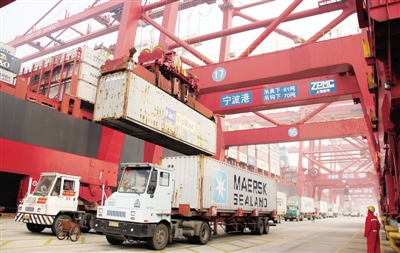 12月20日,宁波港三期码头,一艘靠港集装箱货轮在装卸货物。宁波港股份有限公司生产快报显示,截至12月13日,宁波港今年集装箱吞吐量突破1600万标准箱,达1604万标准箱,增长6.7%。索向鲁摄(新华社发)