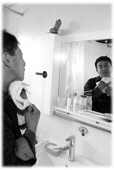 左图 内蒙古包头市东河区北梁棚改居民高俊平在新居内洗漱。他说,“没想到这么快就能住上新房。”高俊平是内蒙古自治区最大的棚户区——包头市东河区北梁棚户区改造工程受益者之一。 新华社记者 张 领摄