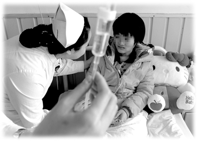 下图 在河北沧州中西医结合医院,一名护士在给患舌癌的12岁小患者王蕊输液。她是被救助的人中年纪最小的癌症患者,医院为她免除的治疗费用已达3万余元。