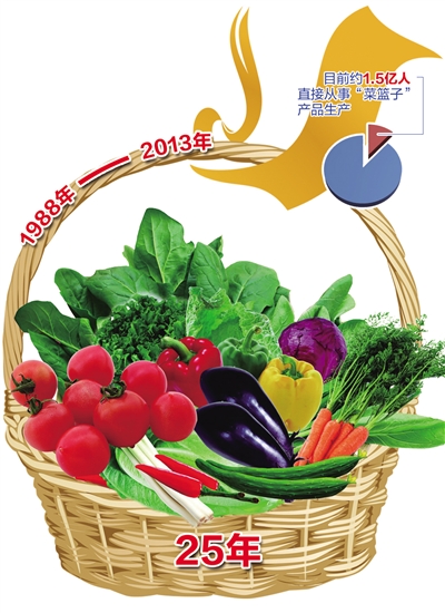 今年是“菜篮子”工程实施25周年。1988年,国务院批准在全国实施“菜篮子”工程,我国农副产品市场供应短缺局面开始改变。2010年,中央又作出了实施新一轮“菜篮子”工程的部署,要求统筹抓好生产能力、市场体系、质量安全、调控保障等多方面建设。据测算,我国“菜篮子”产品产量已连续多年居世界首位,目前约1.5亿人直接从事“菜篮子”产品生产,“菜篮子”产业总产值约4万亿元。