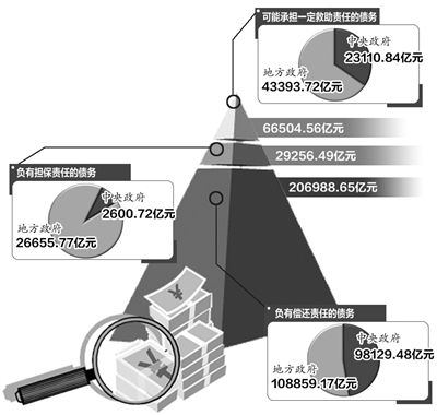 审计署30日公布全国政府性债务审计结果,截至6月底,全国各级政府负有偿还责任的债务206988.65亿元,负有担保责任的债务29256.49亿元,可能承担一定救助责任的债务66504.56亿元。从我国经济发展水平、政府性债务的现状和资产与负债的相互关系看,我国政府性债务风险总体可控,但部分地方政府性债务管理存在风险隐患——
