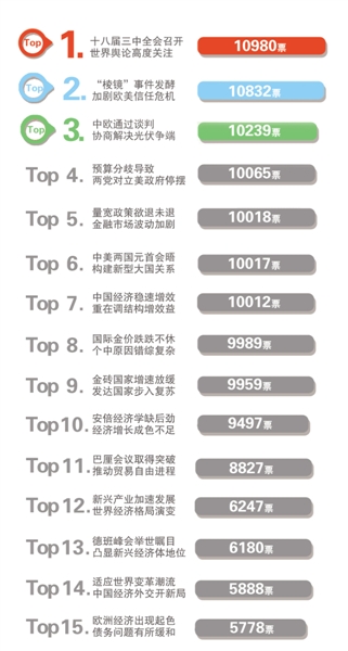 2013年“经济日报十大国际经济新闻”评选结果日前揭晓。本次评选活动时间为2013年12月1日至25日,由经济日报社国际部与中国经济网联合举办。评选采取网友投票与专家评议相结合的方式进行,结果由网上投票与专家投票加权平均计算得出。
