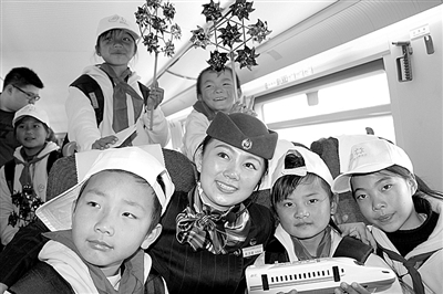 新年前夕,广铁集团与湖南省新田县和广东省广州市花都区携手开行“爱心动车”,来自湖南新田县农村的42名留守儿童乘坐G6014次高铁动车组,赴广州与在外打工的父母共迎新年。图为孩子们在高铁动车组上与列车员合影。