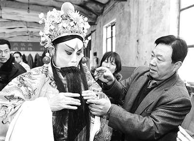 2013年12月29日,在河北省青县木门店镇扣庄村,国家级非物质文化遗产“哈哈腔”第七代传承人刘宗发(右一)帮助演员做上场前的准备工作。春节期间,剧团除在本村演出外,还将赴河间、沧县、山东乐陵等地演出。