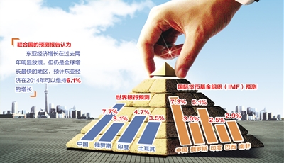 联合国的预测报告认为,东亚经济增长在过去两年明显放缓,但仍是全球增长最快的地区,预计东亚经济在2014年可以维持6.1%的增长,其中中国可能实现7.5%的增长,印度可能恢复到5%以上的经济增幅。拉丁美洲和加勒比地区的经济增长在过去两年明显放缓,但在2014将提速至3.6%,其中巴西经济增长将从2%恢复至3%左右。2013年仅增长1.5%的俄罗斯经济预计在2014年将增长3%左右。