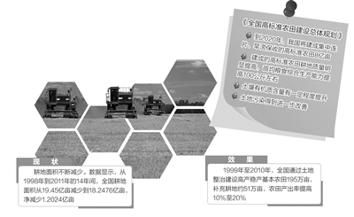 中国国土资源经济研究院副研究员、高级工程师张维宸指出,我国耕地总量虽然有18亿多亩,但有三分之二以上属于中低产田。数据显示,从1998年到2011年的14年间,全国耕地面积从19.45亿亩减少到18.2476亿亩,净减少1.2024亿亩,已逼近18亿亩耕地红线。与此同时,由于长期以来,我国耕地处于“高度紧张的服役”状态,高标准农田建设是让土壤“休养生息”的重要举措。