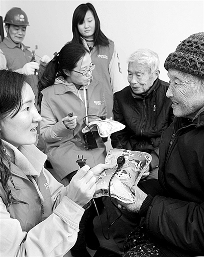 1月5日,志愿者在教老年人正确使用“暖手宝”。当日,国家电网无锡供电公司的“电蜜蜂”党员服务队来到无锡市钱桥镇南塘村敬老院送温暖。
