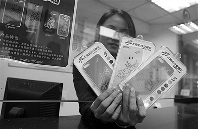 1月7日,上海一处公交卡销售网点工作人员在展示手机壳交通卡。