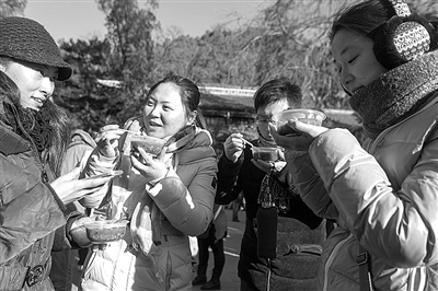 1月8日,市民在北京一处旅游景区排队等候“舍粥”。当日是腊月初八,民间有喝腊八粥的习俗。北京许多寺庙、景区、商家举行腊八文化活动,并为市民提供可口的腊八粥,在冬日里送上温暖的祝福。