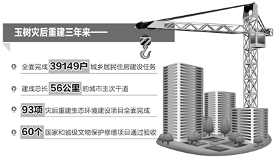 全面完成39149户城乡居民住房建设任务,住房布局更加合理,水电路暖等设施配套,服务功能完备。目前灾区群众已经入住新居。玉树市区总长56公里的城市主次干道全部建成,给排水、燃气、垃圾填埋、污水处理等市政设施建成运营,城镇整体功能极大增强。建成世界海拔最高、规模最大的水光互补微电网发电项目,州内建成110千伏联网工程,电力保障能力比震前提高近2倍。