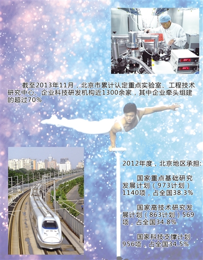 截至2013年11月,北京市累计认定重点实验室、工程技术研究中心、企业科技研发机构近1300余家,其中企业牵头组建的超过70%;推动成立产业技术联盟超过150家,成员单位8700家,其中70%为企业。