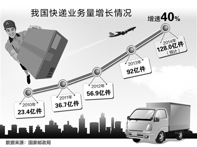 2014年我国快递业务量预计将达到128亿件,同比增长40%