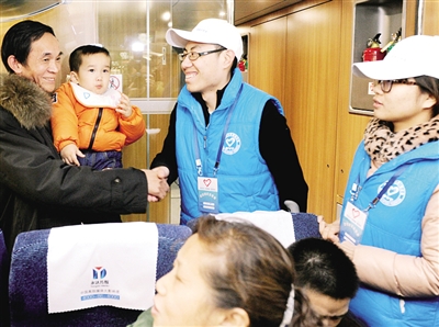 | 春运期间候车室内的志愿者身影格外引人关注,志愿者付博(右二)帮助带孩子的旅客徐诚文老人进站上车,临别时徐诚文紧紧握着付博的手,感激之情溢于言表,也感动了车上的旅客。本报记者 李树贵摄影报道 |