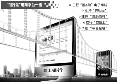 2014年1月12日,工行“融e购”电子商城开业。此前,交通银行的“交博汇”、中国银行的“云购物”、华夏银行的“平台金融”、建设银行的“善融商务”等电子商城相继建成,“银行系”电商队伍日益壮大。