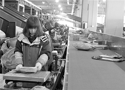 长长的流水线上拉包员、分拣员、扫描员和标识员各司其职地忙碌着。与平日里见到的都是“快递哥”不同,一眼望去,这里几乎都是“娘子军”。身材小巧的曹素娟是60名标识员中的一个,她的工作是为流水线上的快件做“标记”,通过这些标记来区分快件要派送给北京81家分公司中的哪一家。