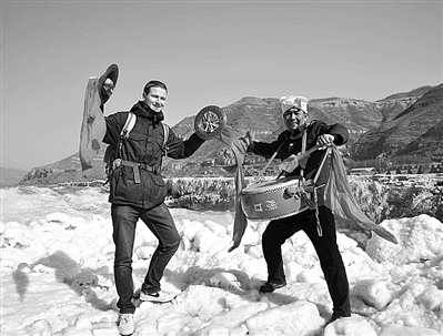 1月25日,一名游客在黄河壶口瀑布景区与民俗演员合影留念。