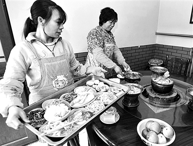 1月26日,北京延庆县井庄镇柳沟村村民在农家院餐厅为游客准备农家宴。火热的冬季农家游让延庆农民忙碌起来。