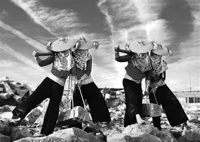 1.福建泉州市惠安县崇武镇大岞村惠安女抬石料。惠安女勤劳简朴,吃苦耐劳,是建设家乡的主力军,如今,她们又以“敢闯敢拼”的精神,在经济建设中创造出新的业绩。