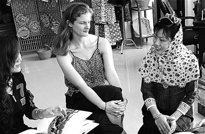 4.泉州市惠安县惠安女曾梅霞(右一)正在商品交易会上与外商洽谈业务。