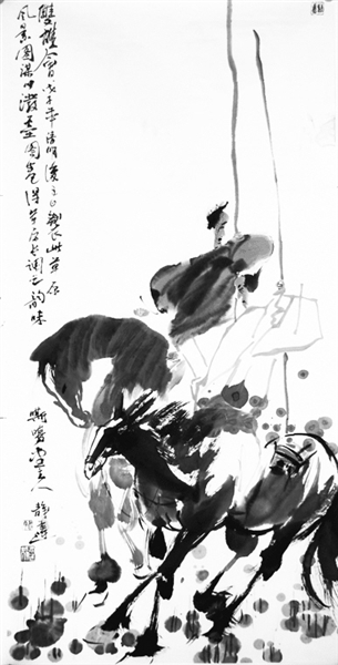 我毕竟是凡夫俗子,我毕生都在奔跑,所以我也画马。崇尚禅师的宁静和敬慕骏马的喧腾,刚好是我生命的二重性,二重奏,复调。我的书房因之称为“嘶鸣堂”,我在一番寂寞的笔耕之后,常常有学马大声嘶鸣的愿望,我自封贩马客,弼马温。我在自作《八骏图》上自题长调自嘲,可见我这东西不论上不上足草料,都会没命地跑,这是我的宿命。