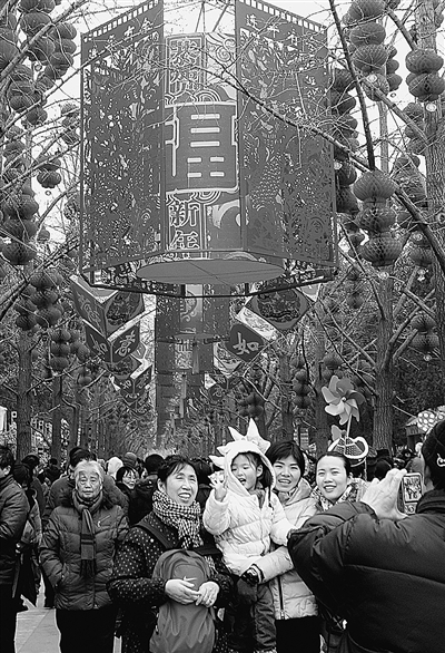 1月31日农历正月初一,游客在北京地坛庙会具有传统特色的灯笼装饰下合影。春节逛庙会,是北京市民的习俗,全家出动,看表演、品小吃,庆新春。 本报记者 翟天雪摄