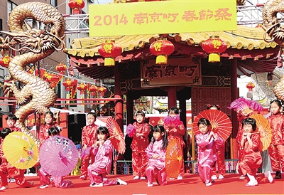 1月31日,日本神户华侨幼儿园的小朋友在南京街表演舞蹈。当日,为期3天的“春节祭”在拥有120多年历史的神户南京街拉开帷幕,吸引诸多游人前来品尝中国美食,并欣赏富有浓郁中国特色的表演。