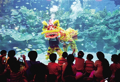 2月1日,在马来西亚吉隆坡,潜水员在水中表演舞狮。当日,为庆祝新春,吉隆坡水族馆的潜水员打扮成财神向参观者拜年,并在水中进行舞狮表演。