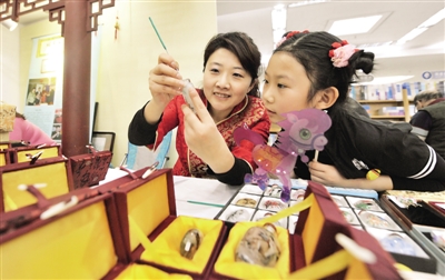 2月2日,游客在北京图书大厦春节文化庙会上体验传统手工制作。扎风筝、虎头鞋、北京绒鸟、皮影、面塑等传统手工艺制作走进书店,让游客近距离体验民俗文化,欢欢喜喜过春节。