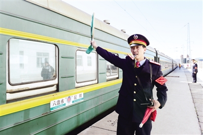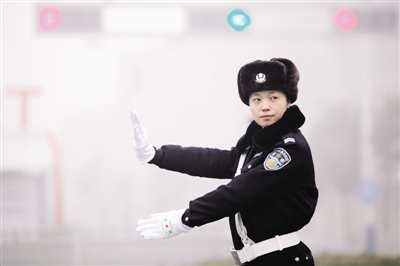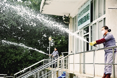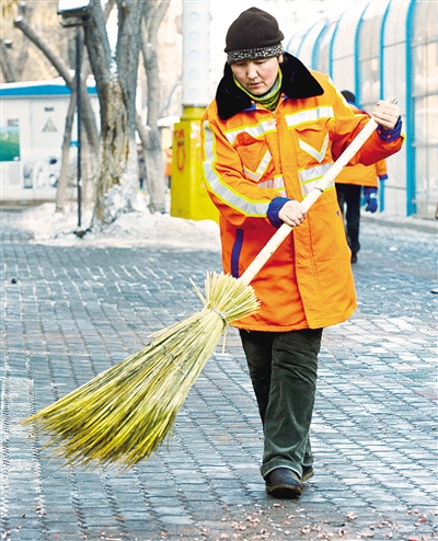 环卫工人在乌鲁木齐市光明路打扫卫生。