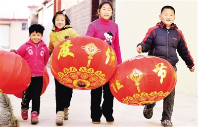 | 山东邹平县成五村,孩子们争相挂起大红灯笼。 |