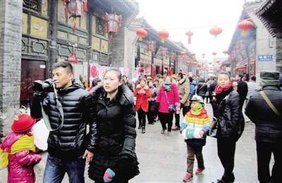 | 2月4日,山西平遥古城明清街上,游客络绎不绝。利用假期外出旅游成为越来越多人欢度春节的选择。 |
