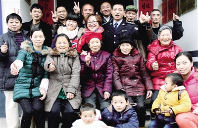 | 2月3日,四川广安市邻水县公安局牟家派出所马渡河警务室的村警冯永明(着警服者),在团年饭后与乡亲们拍“全家福”。 |