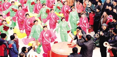 | 锣鼓声声辞旧岁,欢欢喜喜过大年。河北廊坊张岗村村民敲起锣鼓,扭起秧歌度佳节。该村春节期间文化生活丰富多彩。 |