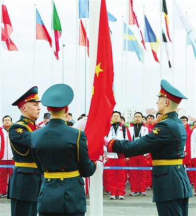 2月5日,中国代表团在升旗仪式上。当日,中国体育代表团在2014年索契冬奥会海滨奥运村内举行升旗仪式。新华社记者 龚 兵摄