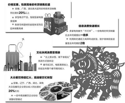 抢红包、全家游、买金饰、看电影……,马年春节,除了看春晚、逛庙会等传统欢庆活动,一些透着亲情、友情和爱情的节庆新时尚也出人意料地“大火”,给传统春节增添了浓浓的年味儿。