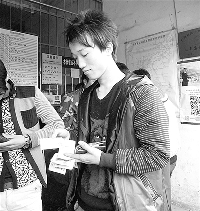 2月5日,湖南凤凰县腊尔山镇火车票代售点,乘客展示自己购买的火车票。该代售点是广铁集团今年春运期间设置的乡镇代售点之一。刘 伟摄