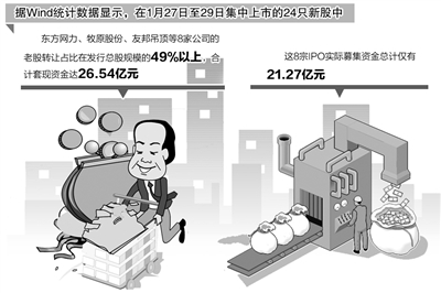 据Wind统计数据显示,在1月27日至29日集中上市的24只新股中,有东方网力、牧原股份、友邦吊顶等8家公司的老股转让占比在发行总股规模的49%以上,合计套现资金达26.54亿元,相比之下,这8宗IPO实际募集资金总计仅有21.27亿元。