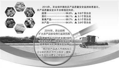 “总体上看,我国农产品质量安全水平逐年提高、不断向好。”在农业部副部长陈晓华看来,评价农产品质量状况好坏有三个考量。一看是否符合国家标准。这也是各国通行的做法。所谓总体上是安全的,反映在指标上,就是96%以上的重点产品都符合国家标准。二看发展的态势。现在的水平与本世纪初相比,质量安全合格率大体提高了30个百分点。三看能否及时发现和查处问题。现阶段出了问题,关键是要及时查处,避免酿成系统性和区域性问题。