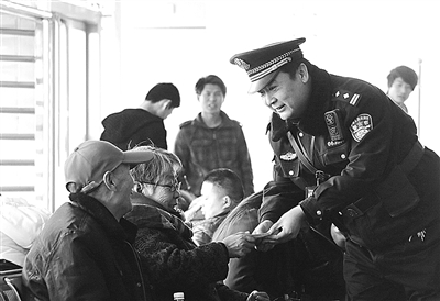 春运客流迎来返程高峰,山西临汾市铁路公安严厉打击各类违法犯罪活动。图为运城站客运民警向旅客讲解如何识别真假火车票。 龙 勇摄
