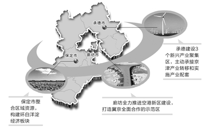 促进区域经济发展,提升区域产业竞争力将是重要抓手,借势京津经济发展的外溢需求,实施产业对接,打造京津产业转移承接地非常重要。为此,河北省要求环京津各市要在建设重点卫星城市和重点园区方面加大力度,使河北环京津地区成为京津产业外溢首选地。其中,距京津最近的廊坊主动发力,全力推进空港新区建设,把空港新区建设作为廊坊未来新的战略平台和发展动力,打造冀京全面合作的示范区。作为北京生态补偿地的承德在北京周边规划建设了3个新兴产业聚集区,主动承接京津产业转移和实施产业配套,并从财政支持、土地优惠等多个方面为入区企业发展提供政策支持。