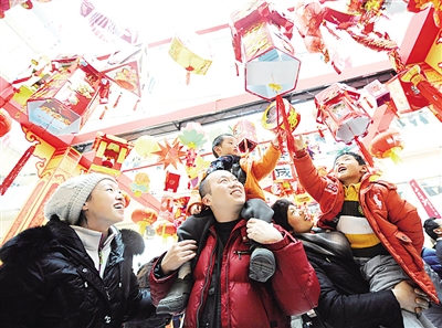 2月12日,市民在灯会现场欣赏花灯。当日,北京崇外地区举办一年一度的元宵灯会。600多盏由社区居民利用节能环保材料制作的彩灯将现场装点一新,大家赏花灯、猜灯谜,其乐融融。