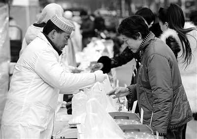 2月12日,在宁夏银川市南关清真寺外,顾客正在选购元宵。据了解,近期,宁夏银川市一些老字号元宵摊位的单日销售量都在三四百斤左右,比起往年,单位统一订购元宵的现象少见,大多以个人散客为主。