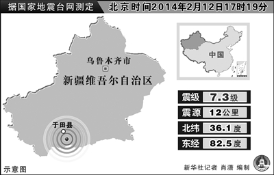 12日17时19分,新疆于田县发生7.3级地震,震中位于北纬36.1度,东经82.5度,震源深度12千米。