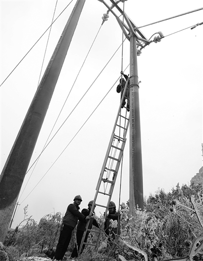 2月10日,贵州省凯里市郊供电局龙场供电所职工在海拔1200多米的香炉山上对输电线进行人工除冰。连日来,受低温雨雪天气影响,凯里电网所辖黔东南境内的138条输电线路出现覆冰情况,凯里供电局组织了1300余人的除冰队伍,设置观冰点571个,及时除冰融冰。