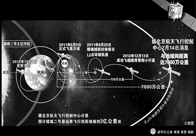 据新华社北京2月14日电 (田兆运 祁登峰) 记者14日从北京航天飞行控制中心获悉,嫦娥二号卫星再次刷新我国深空探测最远距离纪录,达到7000万公里。已成为我国首个人造太阳系小行星的嫦娥二号卫星,目前状态良好,正在绕日轨道上飞向更远深空。