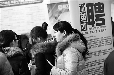 2月15日,北京中国科技会展中心,应聘者正查看招聘信息。当日,春节后首场大型招聘会在京举行。