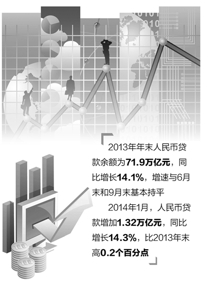 1月份的贷款数据符合市场关于开年贷款大增的预期。中国人民银行2月15日公布的数据显示,1月人民币贷款增加1.32万亿元,再度达到万亿以上规模;从增速看,同比增长14.3%,比2013年末高0.2个百分点。而在去年4季度货币政策执行报告中,央行认为2013年全年“信贷投放总量仍处于较高水平”。由此可见,1月份的贷款规模并不小。