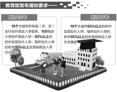 通知明确,2014年,各重点大城市要在义务教育招生入学方面采取切实举措,标本兼治,破解择校难题。到2015年,19个大城市所有县(市、区)实行划片就近入学政策,100%的小学划片就近入学;90%以上的初中实现划片入学;每所划片入学的初中90%以上生源由就近入学方式确定。要逐步减少特长生招生学校和招生比例,到2016年,经省级教育行政部门批准招收特长生的初中学校所招收的特长生比例降到5%以内。没有特长生招生方式的省份不再增设该方式。到2017年,19个大城市95%以上的初中实现划片入学;每所划片入学的初中95%以上的生源由就近入学方式确定。组织考试及与入学挂钩行为得到杜绝,与择校有关的乱收费得到根治。