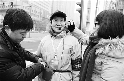 2月12日,陕西西安市碑林区文明办和长乐坊街道办的工作人员给东门外的文明引导员吴萍佩戴有助于保护嗓子的扩音器。经过“武装”后,这里的20名引导员显得格外精神,从扩音器中传出的劝导声也格外温馨入耳。目前,该区总共有50名文明引导员戴上了扩音器。